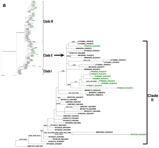 Phylogenetic analysis of hPIV1 based on HN gene constructed using a 1718 nucleotide sequence corresponding to nucleotide 6847–8740 in the Washington_1964 strain (GenBank accession no: NC_003461). The phylogeny of 125 HN gene sequences was analyzed using the maximum likelihood (ML) method in the RAxML and TreeSub programs. The country codes and year of collection are shown. The Russian strains obtained in this study are colored in green: (a) Clade II; (b) Clade III. The two main clades have been demonstrated separately for visibility reasons.