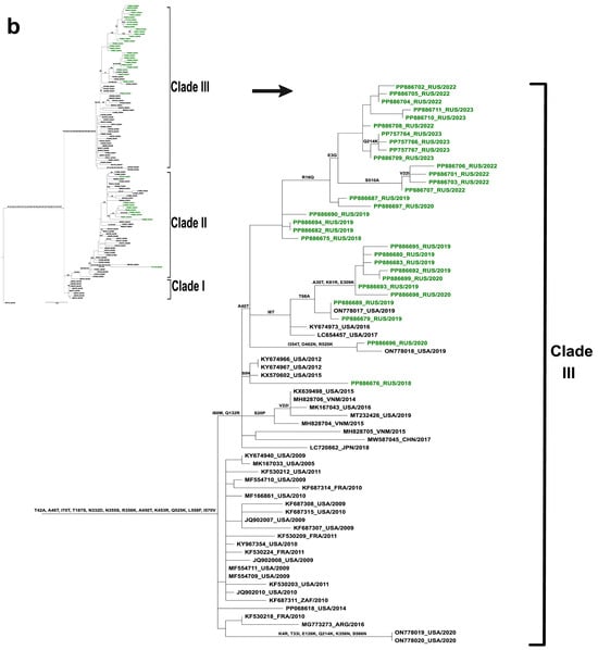 The HN-based phylogenetic analysis further refined these findings, aligning the Russian hPIV1 strains with 84 global sequences from 13 countries: USA, Japan, Vietnam, China, Kenya, Argentina, Thailand, Mexico, France, South Africa, Australia, Switzerland, and The Netherlands (See detailed information in Supplementary Table S3a) (CDS region; 1728 nt). Only GenBank available sequences obtained from wild-type hPIV1 viruses and have no gaps in coverage of the open reading frames in the HN gene are included. The HN gene phylogenetic tree grouped 125 hPIV1 genome sequences into three main branches, referred to as Clades I, II, and III (Figure 7a,b). Among these, clade I, which exclusively incorporates strains from the United States, had been in circulation in the late 1990s, while the two major clades (II and III) are currently prevalent and encompass circulating strains during the time of this study. Our strains were found to co-circulate within the two phylogenetic clades (II and III); however, the majority of them have been grouped within clade III. Eight Russian samples (PP886688, PP886678, PP886691, PP886684, PP886686, PP886681, PP886677, PP886685) isolated in the seasons 2017/18, 2018/19, and 2019/20 were grouped together in clade II (Figure 7a), while one sample (PP886700) was shown to be more closely related to Japanese strains (LC764865 and LC764864). Noteworthy, the strain hPIV1/Russia/SPE-RII-5007S/2023 (PP757765) formed a separate branch in clade II along with virus MW575643 isolated from China in 2018. Clade III was shown to be more diverse, as it includes the thirty-one remaining Russian strains that have been isolated during the studied epidemiological seasons (Figure 7b). All the strains were assembled together close to the top end of the phylogenetic tree, interspersing with strains isolated from the United States in 2020 (ON778017 and ON778018). One strain hPIV1/Russia/SPE-RII-635S/2018 (PP886676) circulation was demonstrated with the most related strains KY674966 (2012), KY674967 (2012), and KX570602 (2015), isolated from the USA, as well.