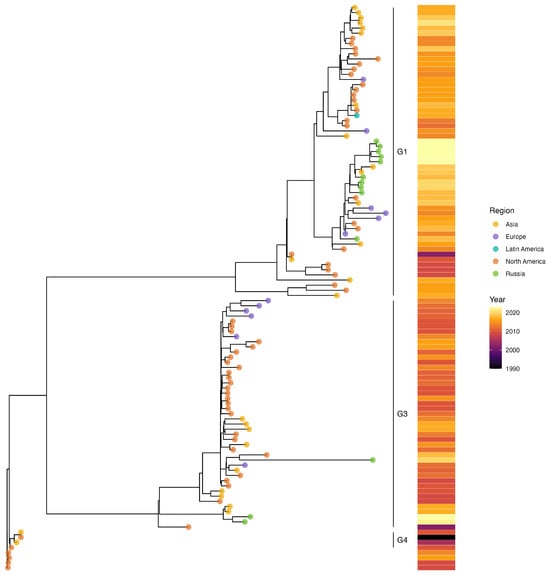 Regarding hPIV2, earlier phylogenetic analyses that used the coding region of the HN gene identified four genetic clusters (G1–G4) [,]. The 13 Russian hPIV2 sequences from this study were distributed between two distinct clusters, G1a and G3, both of which exhibited close genetic proximity to circulating strains from Croatia []. The same phylogenetic distribution was demonstrated by the whole-genome-based ML phylogenetic tree of hPIV2, as well. By integrating whole-genome- and HN-gene-based phylogenetic analyses, this study provides a comprehensive view of the genetic diversity of Russian hPIV1 and hPIV2 strains within the global context.