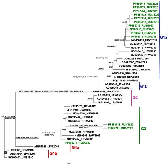 The ML phylogenetic tree of the whole-genome sequences of 97 global hPIV2 strains (Supplementary Table S1a), along with 13 Russian sequences, identified four distinct clades: G1 to G4. The Russian strains were distributed across two clades, G1 and G3 (Figure 8), with three strains (PP886717, PP886721, PP886718) belonging to G3 and the remaining 10 strains (PP886719, PP886720, PP737253, PP886722, PP737254, PP886712, PP886716, PP886715, PP886714, and PP886713) grouped within G1 (subclade G1a).