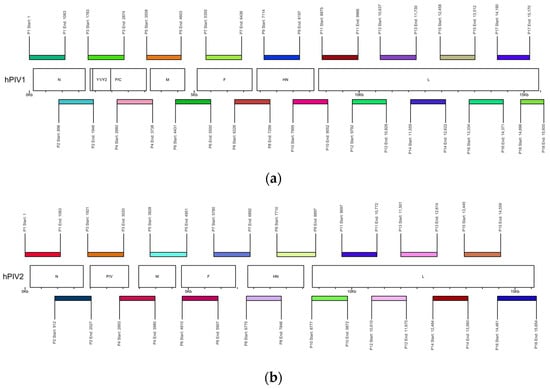 Diagrams illustrating the binding positions of primers along the genomes of hPIV, made using the VizCoV script in the RStudio environment version 2023.09.1+494 (https://github.com/LMV-NIC-St-Petersburg/VizCoV, accessed on 1 December 2024): (a) schematic representation of primer positions mapped across the genome of hPIV1; (b) schematic representation of primer positions mapped across the genome of hPIV2.