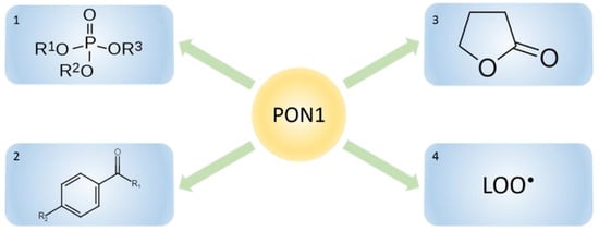 Human PON1 has three types of activity: phosphotriesterase, arylesterase, and lactonase activity [,]. Therefore, PON1 can hydrolyze (and inactivate) a variety of substrates, including aryl esters, thioesters, phosphotriesters, carbonates, lactones, and thiolactones (Figure 1) []. PON1 has three types of activity on several substrates, whereas PON2 and PON3 show high lactonase activity [].