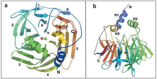 The structure of PON1. (a) View of the six-bladed β-propeller (each blade was marked as 1–6) A—inner β-strand of each blade, B, C— middle β-strands of each blade, D—outer β-strand of each blade, N—N-terminal residues of PON1, C—C-terminal residues of PON1. Ca2+ ions were marked in red and green color. (b) View of the propeller, including the three helices (H1–H3) involved in the binding of PON1 to cell membranes. Reprinted with permission from Ref. []. 2004, Springer Nature America, Inc.