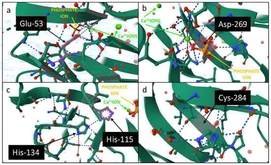 PON1 is a glycoprotein, and its final form consists of 355 amino acids. PON1 protein takes a conformation of a six-bladed β-propeller with a centrally located active site (Figure 2) [,]. The crystal structure of the PON1 active site is solved [,]. It is known that the enzyme catalytic center consists of two calcium ions chelated by side chains of glutamate at position 53 (Glu-53) and aspartate at position 269 (Asp-269), the phosphate ion, and a pair of catalytic histidines (located at position 115 and position 134 of the peptide chain) (Figure 3a–c) []. The calcium ion located near the surface of the active site is considered to play a catalytic role in fixing the orientations of the substrate and related residues (catalytic base). In addition, Asp- 269 is found to coordinate Ca2+ and facilitate the protonation of the alkoxide-leaving group by forming a hydrogen bond with a lactone []. The other Ca2+ is embedded at the bottom of the catalytic cavity, in the channel between blades, and it stabilizes the structure of the catalytic center []. The structural Ca2+ has a much higher affinity for its binding site and it is essential that it remains in the PON1 active site’s dimensional conformation. Dissociation of one of the calcium ions causes irreversible denaturation of the PON1 protein and thus the loss of its enzymatic activity [].