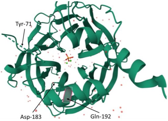 The amino acids engaged in hydrophobicity of the active site of PON1. Localizations of tyrosine at position 71 of the protein chain (Tyr–71), aspartic acid at position 183 of the protein chain (Asp–183) and glutamine at position 192 of the protein chain (Gln–192) were marked in red (protein database (PDB) id. 1V04).