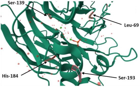 The amino acids providing the phosphotriesterase activity of PON1. Localizations of serine at position 139 of the protein chain (Ser–139), histidine at position 184 of the protein chain (His–184), leucine at position 69 of the protein chain (Leu–69) and serine at position 193 of the protein chain (Ser–193) were marked in red (protein database (PDB) id. 1V04).
