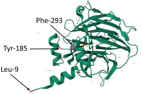 The most important amino acids for the binding of PON1 to HDL. Localizations of phenylalanine at position 293 of the protein chain (Phe–293), tyrosine at position 185 of the protein chain (Tyr–185) and leucine at position 9 of the protein chain (Leu–9) were marked in red (protein database (PDB) id. 1V04).
