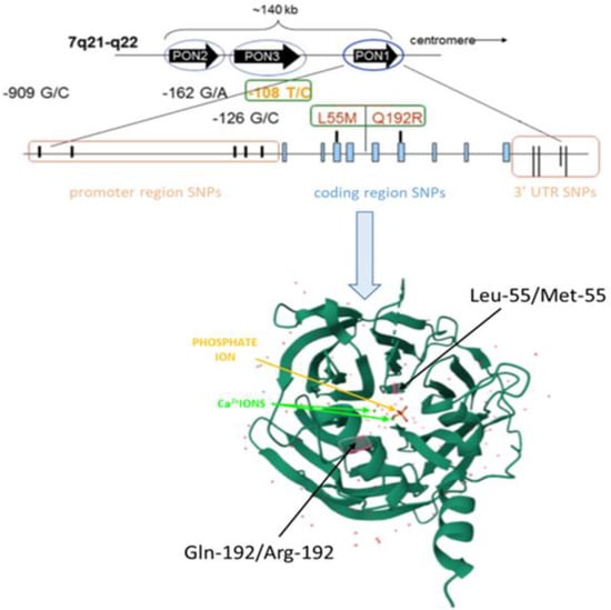 Human paraoxonases (PONs, EC number: 3.1.1.2) are Ca2+-dependent enzymes encoded by PON1, PON2, and PON3 genes located in chromosome 7 (7q21.3-7q22.1) [,]. These genes are structurally very similar; about 70% similarity in nucleotide sequences and about 60% similarity in amino acid sequences have been demonstrated between these genes. The PON1, PON2, and PON3 genes contain nine exons in their structure, but it is worth noting that PON1 has an additional codon in the fourth exon at position 106 (lysine) []. These genes encode the family of hydrolases that consists of three isoenzymes: paraoxonase-1 (PON1), paraoxonase-2 (PON2), and paraoxonase-3 (PON3) []. PON2 is considered to be the oldest evolutionary protein from the paraoxonase group []. Two isoforms of this protein have been observed: non-glycosylated PON2 (40 kDa) and glycosylated PON2 (43 kDa). However, no difference in their functions has been described so far []. PON2 is an intracellular enzyme, and its presence was demonstrated in many tissues, including the liver, kidney, lung, heart, and skeletal muscle []. In contrast to PON2, PON1 and PON3 are primarily synthesized in the liver and then secreted into the bloodstream, where they circulate in the blood in association with high-density lipoproteins (HDL) particles [,,,].