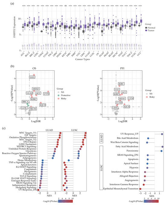 A pan-cancer analysis of SNRPD2 gene expression. (a) SNRPD2 mRNA expression comparison among 26 solid cancer types and their matched normal tissues. The gene expression data were retrieved from TCGA Pan-Cancer and GTEx datasets (unit: log2(TPM+0.001)). The sample size for each group in each comparison is marked by “n”. Differences between normal tissues and tumor tissues were tested by unpaired Student’s t-test (ns, not significant; ***, p < 0.001; ****, p < 0.0001). (b) Analysis of potential prognostic value of SNRPD2 expression. The clinical phenotype data were retrieved from TCGA Pan-Cancer datasets. The Cox regression model was used to calculate hazard ratios (HRs) of SNRPD2 expression for overall survival (OS; left panel) and progression-free interval (PFI; right panel). Grey dot: effect of SNRPD2 expression is not significant; green dot: SNRPD2 is a protective factor (p < 0.05 and HR < 1); pink dot: SNRPD2 is a risk factor (p < 0.05 and HR > 1). (c) SNRPD2 hallmark GSEA on LUAD and LUSC tissues. Hallmark gene sets that are commonly associated with SNRPD2 expression in both LUAD and LUSC are plotted in lollipop format (left panel); the hallmark gene sets specific to LUAD or LUSC are presented in lollipop format (right panel). NES: normalized enrichment score. Cancer type abbreviations used (see Section 4.1) are according to TCGA.