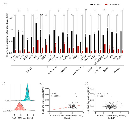 SNRPD2 dependency analysis across multiple cancer cell lines in vitro. (a) Susceptibility of different cancer cell lines to the inhibition of SNRPD2 gene expression. A panel of human cancer cell lines was transduced with an LV silencing SNRPD2 or with a negative-control LV. For every cell line, viabilities were normalized by the matched untransduced control. The data shown are the means + SD of two independent experiments performed in triplicate. Differences between viabilities of cells transduced with LV-EV and LV-shSNRPD2 were tested by unpaired Student’s t-test (ns, not significant; *, p < 0.05; **, p < 0.01; ***, p < 0.001). (b) SNRPD2’s effect on cancer cell viability from RNAi and CRISPR loss-of-function screens. RNAi and CRISPR dependency scores of SNRPD2 were retrieved from the DepMap RNAi (Achilles+DRIVE+Marcotte, DEMETER2) dataset and the CRISPR (DepMap 23Q4 Public+Score, Chronos) dataset. A score of 0 is equivalent to a gene that is not essential; a score of -1 corresponds to the median of all common essential genes. The lowest score indicates the most sensitive cells. (c) Correlation between SNRPD2 expression levels in untreated controls and sensitivity to SNRPD2 RNAi (Pearson correlation analysis, p < 0.0001; dots represent the different cancer cell lines; the red line shows best fit correlation). (d) Correlation between SNRPD2 expression levels in untreated controls and sensitivity to SNRPD2 gene knockout (Pearson correlation analysis, p > 0.05; dots represent the different cancer cell lines; the black line shows best fit correlation).