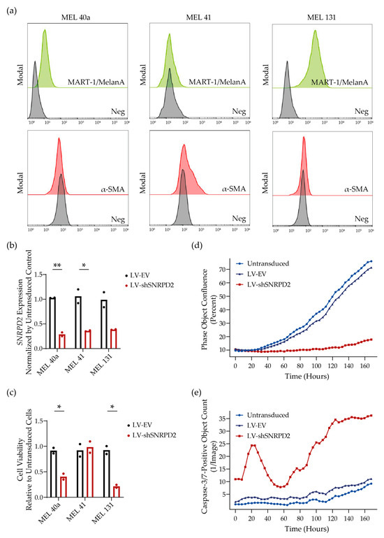 Primary cancer cells more closely mimic the physiological diversity and genetic heterogeneity of the tumors from which they are derived than established cancer cell lines [16,17]. Therefore, we examined the killing effect of silencing SNRPD2 in patient-derived metastatic melanoma cell cultures. For these studies, we established three cultures from different patients; Mel 40a cells were cultured from a skin metastasis, Mel 41 cells from an abdominal lymph node metastasis, and Mel 131 cells from axillary lymph node metastases. The cell cultures were characterized using FACS for melanoma antigen recognized by T-cells (MART1) expression and (myo)fibroblast marker alpha smooth muscle actin (α-SMA) (Figure 3a). While cultured Mel 40a and Mel 131 cells expressed MART1 and were negative for α-SMA as is expected for melanoma cells, Mel 41 cells did not express the melanoma marker MART1, but approximately 20% of the cells were positive for α-SMA. From the Mel 41 lymph node suspensions, we thus most probably cultured a heterogenic mixture of cells including α-SMA-positive lymph node fibroblastic reticulum cells. It is unknown if the 80% MART1 and α-SMA double-negative cell population represents MART1-negative metastatic melanoma cells or non-fibroid stromal cells. We consider the latter more likely, because MART1-negative melanoma metastases are rare [18]. To test the effect of SNRPD2 silencing on the three cell cultures, they were transduced with LV-EV or LV-shSNRPD2 at 4000 genome copies (gc)/cell (Figure 3b,c). SNRPD2 knockdown (60–70%) was confirmed 3 days after lentiviral transduction by quantitative reverse transcription PCR (RT-qPCR) (Figure 3b). One week after transduction, cell viability was measured using CellTiter-Blue. As can be seen in Figure 3c, silencing SNRPD2 effectively killed the two primary melanoma cell cultures Mel 40a and Mel131. In contrast, Mel 41 cells that were presumably not melanoma cells were insensitive to SNRPD2 silencing. For Mel 40a cells, we also monitored cell proliferation and apoptosis over a period of 7 days using live cell imaging (Figure 3d,e). Untransduced and LV-EV transduced primary melanoma cells remained alive and proliferated to reach near-confluence over the observation period, whereas LV-shSNRPD2 transduced cells exhibited apoptosis induction and severely inhibited population growth. Hence, heterogeneous primary melanoma cultures, but not stroma cells isolated from a melanoma-infiltrated lymph node, also experience the cytotoxic effect of Sm gene silencing.
