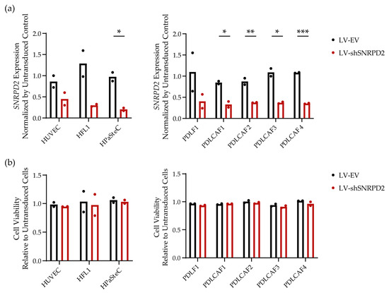 To more elaborately investigate the impact of SNRPD2 silencing on the viability of non-malignant cells, we examined a larger panel of human cell cultures. This included three non-malignant cell lines from diverse tissue origins—i.e., Human Umbilical Vein Endothelial Cells (HUVECs), Human Pancreatic Stellate Cells (HPaSteCs), and Human Fetal Lung fibroblasts (HFL1)—and five patient-derived lung fibroblast cultures, four of which were grown from NSCLC resections. To characterize the patient-derived cells, we used flow cytometry and immunocytochemistry to assess the expression of α-SMA and Pan-Cytokeratin (Figure S4). This revealed that the cell cultures consisted mainly of fibroblasts and were almost or completely devoid of carcinoma cells. In all non-malignant cell cultures except HUVECs, endogenous SNRPD2 expression was approximately 3-fold lower than that measured in the melanoma cultures (Figure S5). Pilot experiments using an LV-expressing enhanced Green Fluorescent Protein (LV-eGFP) showed that an LV dose of 4000 gc/cell efficiently transduced most of the cells in all the tested cell cultures (Figure S6). Therefore, all the cell cultures were transduced with LV-EV or LV-shSNRPD2 at 4000 gc/cell and analyzed using the same methods as were used for melanoma cell cultures (Figure 4). Three days after transduction, the knockdown of SNRPD2 was confirmed, and after one week, cell viability was measured. On different cell cultures, a 50–80% reduction in SNRPD2 expression was observed (Figure 4a). None of the cell cultures exhibited a detectable decrease in cell viability (Figure 4b). Hence, in contrast to cancer cells, all the tested non-malignant cells survived SNRPD2 gene silencing.