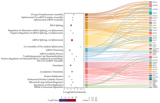 It has been suggested that a similar essentiality profile among different genes in loss-of-function screens indicates that they share common functional units or pathways [19]. Therefore, in search of an explanation for the vulnerability of cancer cells for the loss of SmD2, we performed gene ontology enrichment analysis for biological processes that exhibit codependency with SmD2 in CRISPR screens included in the Cancer Dependency Map dataset. As expected, this showed the highest enrichment values for mRNA splicing processes, followed by protein production and degradation and other mRNA processing steps (Figure 5, Table S4). To find functionally related genes with essentiality profiles similar to SmD2 in RNAi screens, we used the ShinyDepMap web tool [19]. RNAi connectivity analysis revealed 39 genes clustering with SmD2 (listed in Table S5). The gene ontology enrichment analysis for biological processes, in which 35 of these functionally related genes are involved (4 genes not covered in DAVID), highlighted only processes associated with the identified proteasome and ribosome genes (Table S5).