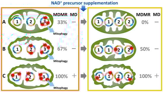 Mitochondrial dysfunction driven by the extent of mtDNA mutations (left) and the therapeutic potential of NAD⁺ precursor supplementation (right). Type A exhibits few mutations, type B has moderate mutations, and type C is characterized by numerous mutations. This diagram illustrates that each mitochondrion contains three mtDNA strands, labeled 1, 2, and 3 sequentially from left to right, with NAD⁺ precursor supplementation therapy resulting in a doubling of the mtDNA strand count. It should be noted that this depiction is a conceptual visualization intended to aid understanding of the mechanism and does not accurately reflect the actual biological system. Irreparable mtDNA mutations (mtDNA strand No. 3) are eliminated via mitophagy. Mitochondrial dysfunction is defined by the presence of mutations in 80% or more of the mtDNA. MDMR, mitochondrial DNA mutation rate; MD, mitochondrial dysfunction.