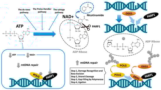 NAD⁺ synthesis involves ATP in several steps (the de novo pathway, the Preiss–Handler pathway, and the salvage pathway) [132]. ATP is essential for NAD⁺ synthesis and recycling, highlighting the interconnectedness of cellular energy metabolism and cofactor availability. If ATP production fails to meet the demand for NAD⁺ consumption over time, PARylation becomes compromised, preventing the completion of the mtDNA repair process. Therefore, chronic activation of mitochondrial PARP1 can deplete NAD⁺ and ATP, triggering mitochondrial dysfunction and eventual cell death (blue square in Figure 4) [138]. PARP1 enables effective mtDNA repair under physiological NAD⁺ concentrations but impairs polymerase activity when NAD⁺ is scarce [139]. These findings indicate that aging diminishes the capacity to repair mtDNA mutations.
