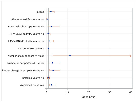 Women’s characteristics identified as important in the univariate analysis with a p-value < 0.2 were entered into a multivariable analysis model to control for possible confounders. Because of the limited number of cases with HSIL histology (<10 patients), a detailed LBC and colposcopy outcomes correlation assessment was not considered since cases with NILM cytology and normal colposcopy were disproportionally represented in this study’s sample. Figure 1 illustrates a diagram of the Odds Ratios (ORs) for those parameters, illustrating statistical significance using as a reference point a positive STI test.