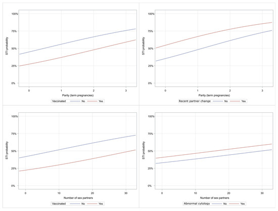 Characteristic curves illustrate the probability of STI positivity. (Upper left): parity and vaccination effect on STI positivity; (Upper right): parity and recent partner change effect on STI positivity; (lower left): number of sex partners and vaccination status on STI positivity and (lower right): number of sex partners and abnormal cytology role in STI positivity risk. The Vertical axis shows the probability of STI positivity.