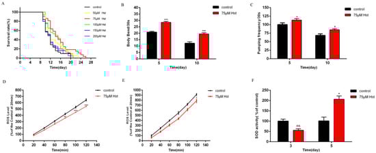Then, the effect of 75 μM Hst on the healthy lifespan indices and indicators of oxidative stress in normal C. elegans was determined. Normal C. elegans were respectively treated with 0 μM (control) and 75 μM Hst, and their different healthy lifespan indices are shown in Figure 2B,C. Compared with the control, 75 μM Hst treatment for 5 and 10 d increased the frequency of body bending by 36.82% (p < 0.001) and 59.57% (p < 0.001), respectively; additionally, it increased the frequency of pharyngeal pumping by 13.06% (p < 0.05) and 23.72% (p < 0.05), respectively. The ROS and SOD contents in the control and 75 μM Hst-treated C. elegans are shown in Figure 2D–F. Compared with the control, C. elegans treated with 75 μM Hst for 3 d and 5 d showed 15.18% (t = 60 min, p < 0.05) and 13.53% (t = 120 min, p < 0.05) lower ROS levels, respectively, whereas 75 μM Hst treatment for 5 d increased the SOD activity by 104.67% (p < 0.05). These results suggest that 75 μM Hst may increase the lifespan and antioxidative ability of normal C. elegans by decreasing the ROS levels and increasing the SOD activity in vivo.