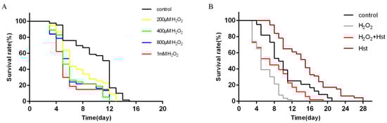 Effects of H2O2 on the lifespan of C. elegans and Hst on the lifespan of C. elegans under chronic oxidative stress. (A) Different C. elegans lifespan resulted from different doses of H2O2 treatment. (B) Effect of Hst on the lifespan of C. elegans under chronic oxidative stress. Data were derived from three independent replicates.