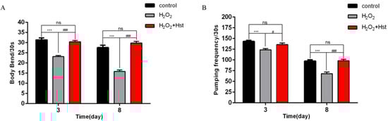 Effects of 75 μM Hst on the healthy lifespan indices of C. elegans under chronic oxidative stress. (A) The frequency of the body bending of C. elegans in the control, H2O2, and H2O2 + Hst treatment. (B) The frequency of the pharyngeal pumping of C. elegans in the control, H2O2, and H2O2 + Hst treatment. Data were derived from three independent replicates and presented in mean ± SEM, *** p < 0.001 and ns p > 0.05 compared with the control (0 μM Hst); # p < 0.05 and ### p < 0.001 compared with the H2O2 treatment.