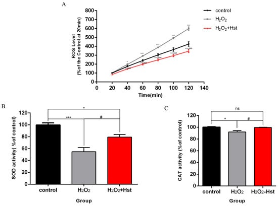Effects of 75 μM Hst on ROS, SOD, and CAT in chronic oxidative stress C. elegans. (A) ROS fluorescence dynamics of C. elegans in different treatments. (B) SOD activity of C. elegans in different treatments. (C) CAT activity of C. elegans in different treatments. Data were derived from three independent replicates and presented in mean ± SEM, * p < 0.05, ** p < 0.01, *** p < 0.001 and ns p > 0.05 compared with the control (0 μM Hst); # p < 0.05 and ### p < 0.001 compared with the H2O2 treatments.