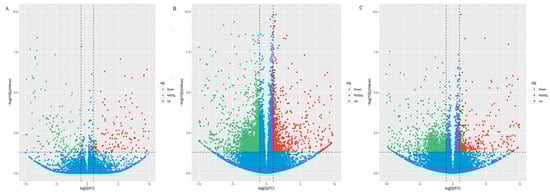 Volcano map of the differentially expressed transcripts. (A) Differentially expressed transcripts between the control and H2O2 treatment. (B) Differentially expressed transcripts between the control and H2O2 + Hst treatment. (C) Differentially expressed transcripts between the H2O2 and H2O2 + Hst treatment. Each point represents a gene, and the horizontal coordinate represents the logarithmic value log2 (fold change) of the expression difference of genes between the two groups. The ordinate represents the padj (q) value of the change in gene expression minus the value log10 (padj). The greater the absolute value of the horizontal coordinate, the greater the difference of the expression multiple between the two groups. The larger the ordinate value, the more significant the differential expression. Downregulated differential genes are shown with green dots, upregulated differential genes are shown with red dots, and unchanged genes are shown with blue dots. UP/DOWN is the number of differentially expressed transcripts upregulated or downregulated between two treatments.
