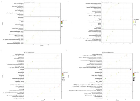 GO analysis of differentially expressed transcripts in the H2O2 + Hst treatment compared with the control and H2O2 treatment, respectively (A) GO analysis of upregulated differentially expressed transcripts in H2O2 + Hst treatment compared with the control. (B) GO analysis of down-regulated differentially expressed transcripts in the H2O2+Hst treatment compared with the control. (C) GO analysis of upregulated differentially expressed transcripts in the H2O2 + Hst treatment compared with the H2O2 treatment. (D) GO analysis of downregulated differentially expressed transcripts in the H2O2 + Hst treatment compared with the H2O2 treatment. This figure selected the top 10 GO terms to plot according to the enrichment order, and displayed all if less than 10. The vertical coordinate represents the GO term, and the horizontal coordinate represents the p-value of each term minus the value −log10 (p). The circle represented represents the transcripts enriched in each term, and the size of the circle represents the number of transcripts. The circle color indicates the significance of the term, and the redder the color, the more significant the term.