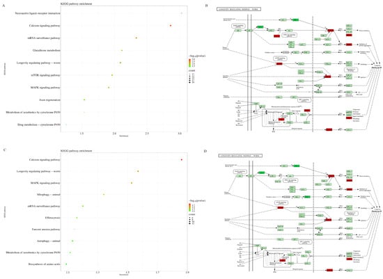 KEGG analysis of differentially expressed transcripts in the H2O2 + Hst treatment compared with the control and H2O2 treatment, respectively (A) KEGG analysis of differentially expressed transcripts in the H2O2 + Hst treatment compared with the control. (B) The differential transcripts of the H2O2 + Hst treatment compared with the control were enriched in the longevity regulating pathway of nematodes, where red shows those upregulated and dark green are those downregulated. (C) KEGG analysis of differentially expressed transcripts in the H2O2 + Hst treatment compared with the H2O2 treatment. (D) The differential transcripts of the H2O2 + Hst treatment compared with the H2O2 treatment were enriched in the longevity regulating pathway of nematodes.