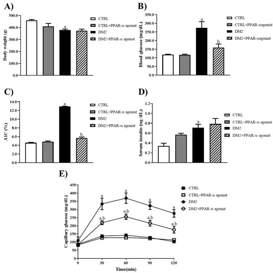 2.1. PPAR-α Agonist Decreases Hyperglycemia but Does Not Prevent Body Weight Loss in Type 2 Diabetic Rats