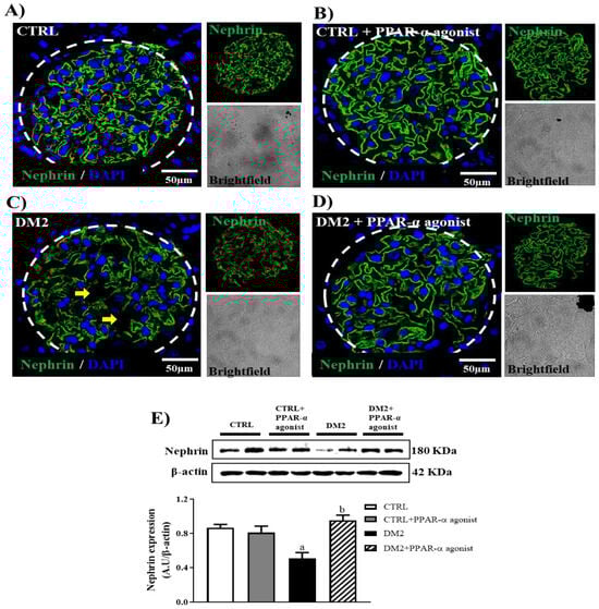 2.2. PPAR-α Agonist Treatment Improves Diabetes-Induced Renal Dysfunction and Nephrin Expression