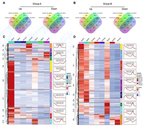 Transcriptome expression profiles revealed the genes expressed in the samples from different treatments. In Group A, 37,578, 36,510, 36,555, 36,506, 36,407, 34,401, and 34,736 genes were expressed during the N5V0, N8V0, N11V0, N14V0, N5V3, N8V3, and N8V6 periods, respectively. It was found that 30,030 genes were co–expressed in all treatments (Figure 2E). In Group B, during the N4V0, N8V0, N10V0, N11V0, N14V0, N4V4, N10V1, and N10V4 periods, 38,164, 35,531, 36,655, 36,516, 35,841, 36,834, 35,672, and 35,485 genes were expressed, of which, 29,769 genes were found to be co–expressed in all treatments (Figure 2F).