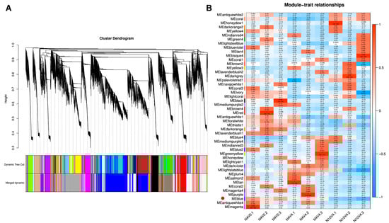 To explore the correlation network between the age pathway and vernalization, the WGCNA technique was employed to identify modules related to the age pathway regulation of vernalization. Expressed genes from N4V0, N4V4, and N10V4 samples in Group B, which were highly correlated with the age pathway in regulating vernalization, were selected to construct the WGCNA co–expression network. Similar branches of the gene clustering tree were merged (Figure 9A), resulting in a total of 48 co–expression modules, with the largest proportion of genes found in the blue module. The correlations in the age pathway regulation of vernalization were similar for N4V0 and N4V4 but were opposite for N10V4. Among all modules, only the blue module was consistent with expectations. Meanwhile, the candidate genes AfisC1G06103, AfisC1G06473, AfisC2G01843, AfisC2G04220, AfisC2G06661, AfisC3G06612, and AfisC7G03599 in age–regulated vernalization, as well as the candidate gene AfisC7G05578 in vernalization, are all located in the blue module (Figure 6, Figure 8 and Figure 9B).