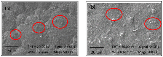 Chlorella is characterized by spherical cells with a reported size ranging from 3 to 8 µm in diameter. As a result of this study, microalgae with an average size of 8 µm were obtained (UTEX), as depicted in Figure 4 and highlighted in red circles. For samples treated at a concentration of 3 g/L, no significant differences were observed between the two evaluated times (p < 0.05). Conversely, at a concentration of 5 g/L, the sample immersed for a longer duration in the biomass exhibited a greater cell population on the surface. It can be affirmed that higher biomass concentration and exposure time increase the concentration of microalgae on the material surface. This is attributed to the availability of more molecules to interact with the surface, increasing the likelihood of encountering binding sites and facilitating covalent bond formation, thereby enhancing adhesion probabilities. Felgueiras et al. [37] reported that a higher substrate concentration on a surface typically leads to greater adhesion. However, once all binding sites on the surface are occupied, a saturation point is reached where adhesion does not significantly increase with higher concentrations.