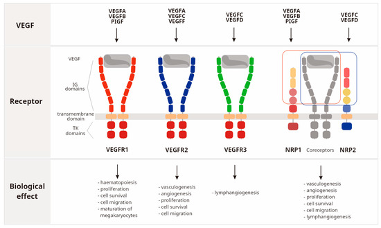 The vascular endothelial growth factor (VEGF) family includes several members: VEGFA, VEGFB, VEGFC, VEGFD, VEGFE, VEGFF, PlGF (placenta growth factor), and EG-VEGF (endocrine gland-derived vascular endothelial growth factor) [1,2,3,4,5]. The VEGF family is a part of the platelet-derived growth factor (PDGF) superfamily that contains a cystine knot domain with eight conserved cysteine residues [3]. Signaling of growth factors from the VEGF family occurs via several receptors: fms-like tyrosine kinase 1 (VEGFR1/Flt1), human kinase insert domain receptors (VEGFR2/KDR), fms-like tyrosine kinase 4 (VEGFR3/Flt4), and neuropilins-1 and -2 (NRP1, NRP2) [1,2,3,4,5]. VEGFRs are transmembrane tyrosine kinase receptors, whereas NPRs are non-tyrosine kinase receptors that lack cytoplasmic enzyme activity [2,3]. Specific growth factors from the VEGF family bind to selected VEGFR receptors, VEGFR1: VEGFA, VEGFB, and PlGF; VEGFR2: VEGFA, VEGFC, and VEGFE; and VEGFR3: VEGFC and VEGFD [1]. Moreover, VEGFA, VEGFB, and PlGF bind to NRP1, whereas VEGFC as well as VEGFD bind to NRP2 receptors [3]. VEGF family proteins have different functions depending on the receptor they attach to. VEGF signaling through VEGFR1, VEGFR2, and NRP1 receptors regulates cell proliferation, migration, survival, and vascular permeability during vasculogenesis and angiogenesis; in turn, signaling through VEGFR3 and NRP2 is responsible for lymphangiogenesis [1,2,3] (Figure 1).