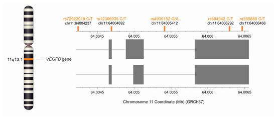 Five polymorphisms of the VEGFB gene were selected for the study: rs72922019, rs12366035, rs4930152, rs594942, and rs595880. The rs72922019 and rs4930152 polymorphisms are intron variants, and rs594942 and rs595880 are 3-prime UTR variants, whereas rs12366035 is a synonymous variant [23]. Figure 2 shows the VEGFB gene with the location of the studied SNPs. Alleles and genotypes’ frequencies for studied polymorphisms are shown in Table 1.
