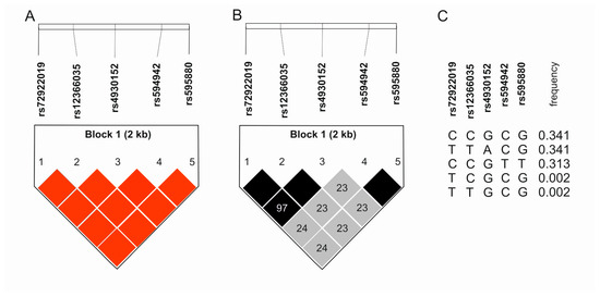 Linkage analyses between studied polymorphisms. (A) Haplotype block with D’ value. (B) Haplotype block with R2 value. (C) Haplotypes and their frequency. Colors highlight the degree of linkage disequilibrium. The darker the color, the greater the D’ or R2 values.