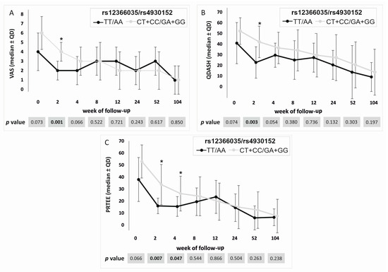 Medians (±QD) of PROM values for carriers of different rs12366035 and rs4930152 genotypes. Results for (A) VAS, (B) QDASH, and (C) PRTEE. Legend: QD, quartile deviation; PROM, patient-reported outcome measure; VAS, visual analog scale; QDASH, quick version of disabilities of the arm, shoulder, and hand score; PRTEE, patient-rated tennis elbow evaluation; *, significant difference (p < 0.050).