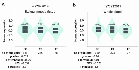 In silico analysis of rs72922019 VEGFB gene polymorphism influence on expression level. Results for (A) skeletal muscle tissue and (B) whole blood. Based on GTEx Portal [24].