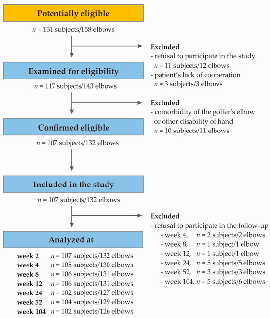 The selection of patients took place between November 2018 and November 2019, with data collection continuing until November 2020. A flow diagram of the study selection process is provided below (Figure 6). The study involved 107 Polish Caucasian participants from Upper Silesia, including 65 women and 42 men, aged between 24 and 64 years (median ± QD: 46.00 ± 5.50). All were diagnosed with lateral elbow tendinopathy (with 25 cases of bilateral involvement), classified under the ICD-10 code M77.1. Importantly, age did not affect therapy effectiveness. All patients displayed characteristic LET symptoms such as pain at the origin of the common extensor, tenderness upon the palpation of the lateral epicondyle, muscle weakness, morning stiffness, a history of limb overuse or injury, and positive results for Thomson’s, Mill’s, and Cozen’s tests.