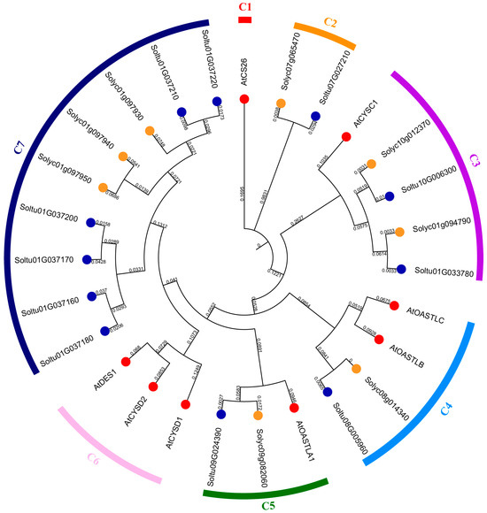 - Liu, D.; Lu, J.; Li, H.; Wang, J.; Pei, Y. Characterization of the O-acetylserine(thiol)lyase gene family in Solanum lycopersicum L. Plant Mol. Biol. 2019, 99, 123–134. [Google Scholar] [CrossRef]