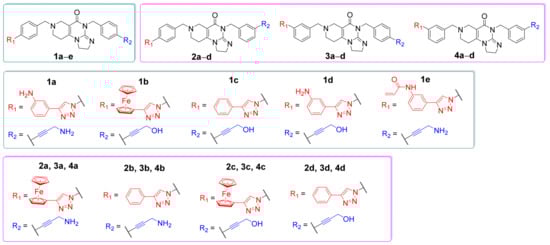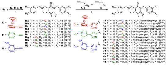 We continued with copper-catalyzed azide-alkyne cycloadditions of 12a–e using ethynylferrocene (13), phenylacetylene (14), and 3-aminophenylacetylene (15) as coupling partners, resulting in triazoles 16a–j in mediocre to good yields (Scheme 2). Afterward, switching to the conditions of the Sonogashira reaction, iodinated 1,3-triazolyl compounds 16a–e and 16g–j were coupled with propargylamine 17a and propargyl alcohol 18 to obtain 1a–d, 2a–d, 3a–d, and 4a–d, the first set of the designed compounds intended for in vitro viability screening (Scheme 2).