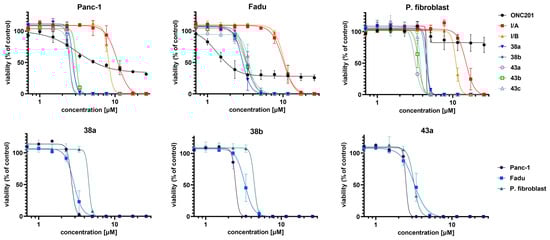 The most efficacious compounds from the second set (38a,b) and 43a–c, the fluorinated analogs of 38b, were selected for systematic dose–response studies and determination of IC50 values. The measurements were conducted on PANC-1 and Fadu cells and non-tumorous primary fibroblast cells to assess the cytotoxicity profile and therapeutic window of the investigated compounds. For the sake of consistency, the dose–response curves were also detected for ONC201, I/A, and I/B, which served as relevant reference standards. The resulting dose–response curves are depicted in Figure 5, and the corresponding IC50 values are listed in Table 3 (see also Supplementary S.89, S.90).