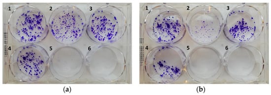 Colony formation assay of selected imipridone derivatives with PANC-1 cell line at a concentration of 4 µM: (a) 24 h treatment followed by 5 days post-incubation; (b) 72 h treatment followed by 3 days post-incubation. 1: DMSO (control), 2: ONC201, 3: I/A, 4: I/B, 5: 38a, and 6: 38b. Representative images are shown; n = 2.