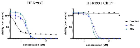 Dose–response curves of imipridone hybrids 38a,b and ONC201. Viability measured in HEK293T and HEK293T−/− cell lines based on the CellTiter-Glo cell viability assay. Curves were fitted by GraphPad Prism 9.5.0 software using nonlinear regression (variable slope; 95% CI; n = 4). The concentration scale is logarithmic. The R2 values were consistently above 0.95.