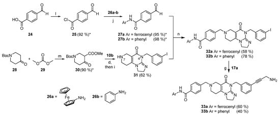 The second type of amides, 33a,b, were accessed by multistep convergent synthetic pathways (Scheme 5). The first pathway led to N-arylamides of 4-formylbenzoic acid 27a and 27b obtained from 4-formylbenzoylchloride 25 by treatment with aminoferrocene 26a and aniline 26b, respectively. The second pathway started with carboxymethylation of N-Boc-oxopiperidine 28 effected by dimethyl-carbonate-mediated 29. The generated oxocarboxylate 30 was condensed with 3-iodobenzyl-substituted 2-amino-3,4-dihydroimidazole (10b: cf. Scheme 1), constructing the N7-Boc protected imipridone scaffold of which treatment with concentrated hydrochloride acid afforded 4-(3-iodobenzyl)-substituted cyclic secondary amine 31. Finally, the convergent synthesis was continued by triacetoxyhydroborate-mediated reductive alkylation of 31 by 27a and 27b to obtain amides 32a and 32b, respectively, which were then subjected to Sonogashira coupling with propargylamine 17, resulting in the formation of the targeted imipridone models 33a,b.