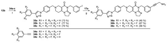 Synthetic route to 36a–c, the fluorinated derivatives of 2b. Reaction conditions: (f) CuI (0.1 eq.), DMSO, r.t., 24 h; (g) propargylamine (2 eq.), CuI (0.2 eq.), PdCl2(PPh3)2 (0.1 eq.), DIPEA (3 eq.), DMF, r.t., 24 h.