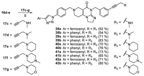 Finally, as the results of the first screening suggested that a basic aminopropynyl group was more beneficial in reducing cell viability than a hydroxypropynyl group (comparing the activity of 2a,b and 2c,d: Section 2.2 and Table 1), we set out to investigate the effect of fine-tuning the basicity and size on antiproliferative activity. Thus, we introduced methylamino-, dimethylamino-, piperidinyl-, N-methylpiperazinyl-, and morpholinyl groups in the aryltriazolyl-substituted imipridone scaffold using Sonogashira coupling of iodinated precursors 16a–d with N-propargylated amines 17c–g, constructing a further subset of alkyne-tethered hybrids (38a,b, 39a,b, 40a,b, 41a,b and 42a,b: Scheme 8), the evaluation of which might lead to the recognition of further structure–activity relationships.