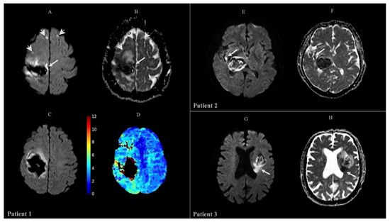 Representative neuroimaging of three patients. Patient 1: MRI at T2 reveals a large intraparenchymal hematoma within the right fronto-parietal lobe. (A) DWI sequences identify linear regions of restricted diffusion in the anterior perilesional area and the posteromedial region, with corresponding hypointensity on the ADC map (B), suggestive of ischemic injury (arrow). Additionally, small ischemic foci, measuring a few millimeters, are observed in the right frontal subcortical paramedian region and at the left frontal subcortical level (arrowheads). (D) Perfusion-weighted imaging (PWI) shows a significant increase in Tmax within the right parieto-occipital region and posterior temporal lobe, surrounding a large hematoma located in the right fronto-parietal lobe (C). Patient 2: MRI at T1 demonstrates a hematoma located in the right thalamo-capsular region with slight contralateral shift in the midline structures. (E) DWI imaging shows a perihematomal 5 mm2 area of diffusion restriction, with corresponding hypointensity on the ADC map (F), consistent with a small recent ischemic lesion (arrow). Patient 3: MRI at T1 reveals a hemorrhagic focus in the left insula and basal ganglia, with slight lateral ventricle compression. (G) DWI imaging demonstrates a region of restricted diffusion in the posteromedial perilesional area, with corresponding hypointensity on the ADC map (H), suggestive of ischemic injury (arrow).