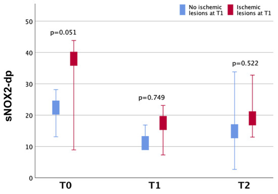 Patients with ischemic lesions at T1 showed a higher median serum concentration of sNOX2-dp at T0 compared to those without ischemic lesions, although the difference had a borderline statistical significance (34.9 pg/mL vs. 22.4 pg/mL, p = 0.051) (Figure 2 and Supplementary Table S3).