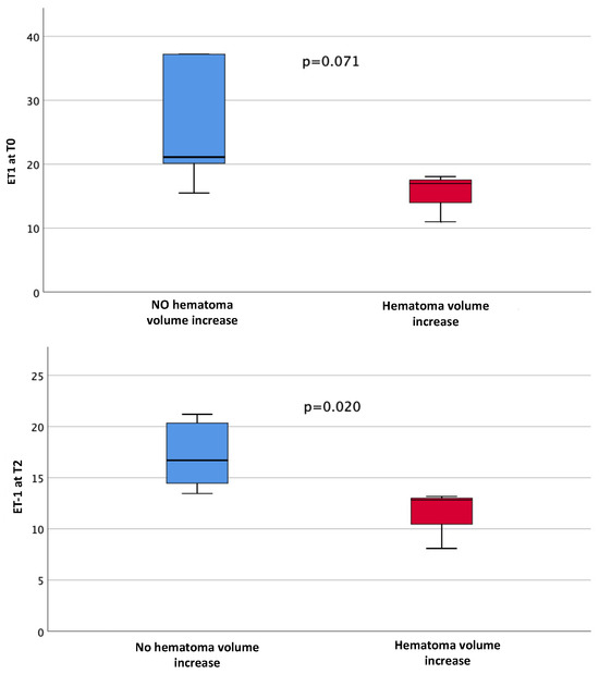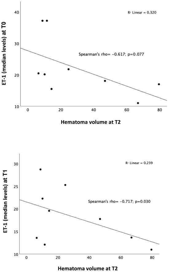 Higher levels of ET-1 at T1 significantly correlated with smaller hematoma volumes at T2 (Spearman’s rho = −0.717, p = 0.030) with only a trend toward the statistical significance for ET-1 levels at T0 (Spearman’s rho = −0.617, p = 0.077) (Figure 3).